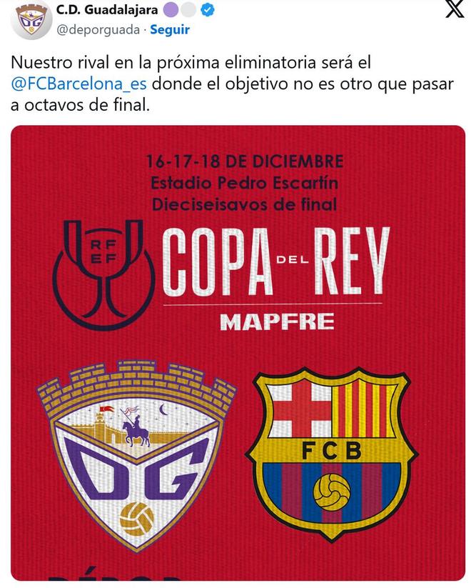 在国王杯十六分之一决赛抽签中,瓜达拉哈拉成功抽中了巴塞罗那作为对手。比赛将于12月16日至18日之间进行。